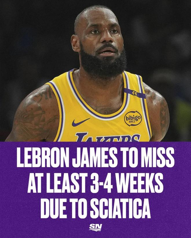 根据名记Shams的报道称,詹姆斯因右侧坐骨神经痛将在大约3到4周后复查,这意味着詹姆斯不仅将无缘所有季前赛,还将无法出战新赛季的揭幕战,这将是詹姆斯生涯23个赛季中第一次缺席赛季揭幕战。